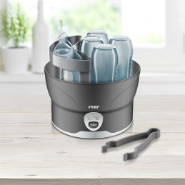 Höyrypohjainen desinfiointi on lempeä materiaaleille ja ympäristölle. Laitteessa on tilava sisus, johon mahtuu jopa 6 tuttipulloa sekä pieni irrotettava tarvikekori tutteja, puruleluja ja syöttötarvikkeita varten.