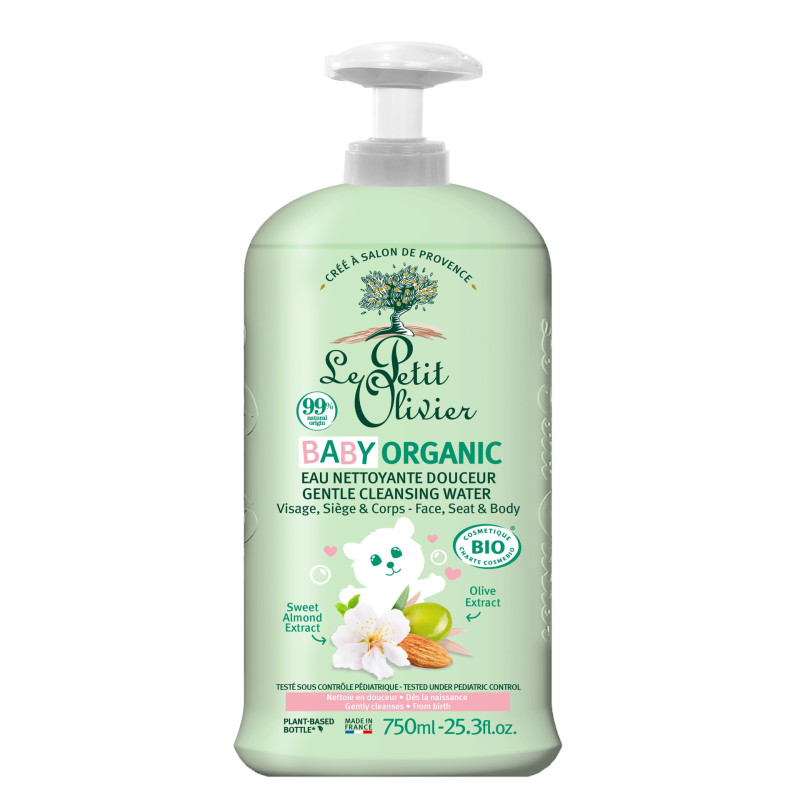 Ecocert-sertifioitu Le Petit Olivier Puhdistusvesi vauvoille puhdistaa vauvan herkän kasvojen ja vartalon ihon hellävaraisesti. Tämä erittäin mieto, väriaineeton ja saippuaton koostumus on pH-neutraali, rauhoittaa ihoa ja jättää jälkeensä pehmeän, syleilevän tuoksun.