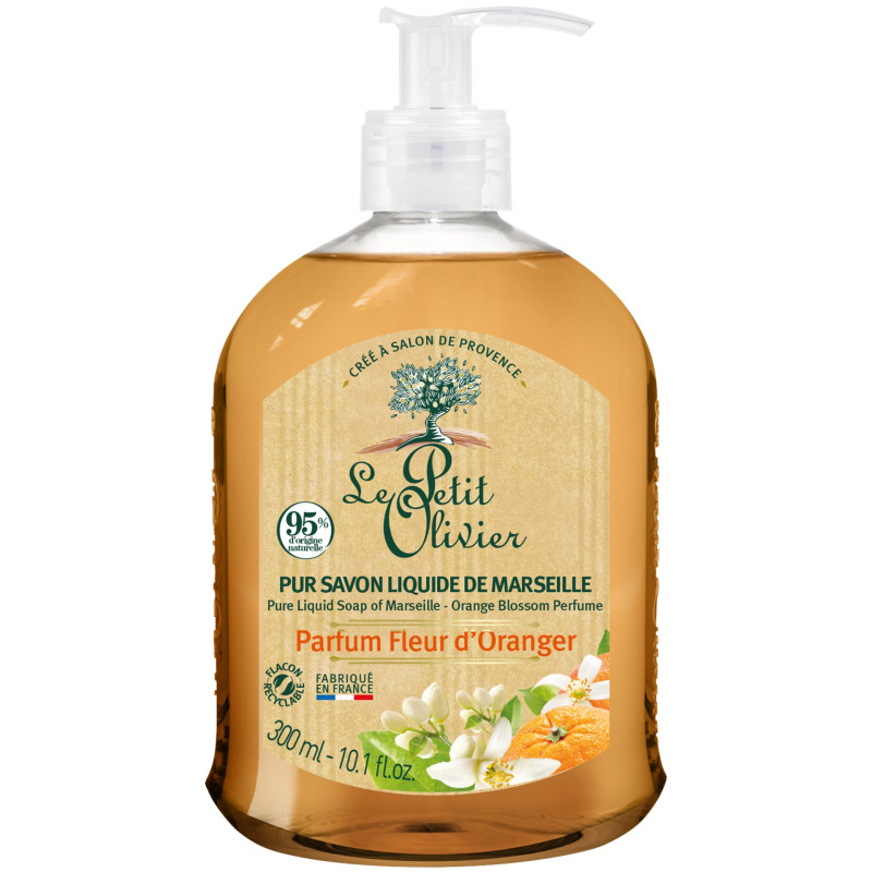 Appelsiinilta tuoksuva nestemäinen Marseille-saippua sisältää 95 % luonnollisia ainesosia ja pohjautuu korkealaatuisiin kasviöljyihin – kookosöljyyn ja oliiviöljyyn. Oliiviöljy tunnetaan sen ihoa uudistavista, kosteuttavista ja ravitsevista ominaisuuksista. Luonnollinen glyseriini huolehtii ihon kosteustasapainosta ja tekee siitä ihanan pehmeän ja joustavan. Saippua valmistetaan perinteisin menetelmin padassa keittämällä, mikä takaa sen puhtauden ja laadun.