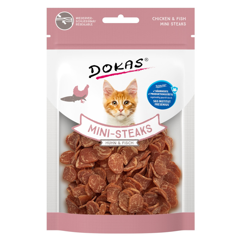 Dokas minipihvit ovat erinomainen ja terveellinen kissanherkku runsaalla 35% raakavalkuaispitoisuudellaan. Kissan minipihvi on herkullinen, pehmeän pihvimäinen makupala kissalle kuin kissalle! 25g pussissa on reilusti herkuteltavaa, makuna kana ja kala.