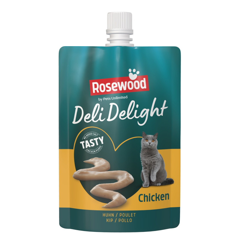 Nirsoja tai vain erittäin älykkäitä, kissat tietävät tarkalleen mitä haluavat, ja se on Rosewoodin herkkutahna! Ne syövät sitä kirjaimellisesti kädestäsi, koska kissat eivät voi vastustaa suurta kanan määrää ja sen herkullista makua. Se on täydellinen päivittäinen välipala, koska se sisältää vähän rasvaa, eikä sisällä lisättyä sokeria tai suolaa eikä keinotekoisia väri-, maku- tai tuoksuaineita. Ei mitään turhaa! Käytä tahnaa aterian kruununa, lääkkeiden piilottamiseen tai yksinkertaisesti herkullisena välipalana. Kätevän korkin ansiosta voit helposti annostella välipalan pienempiin annoksiin.