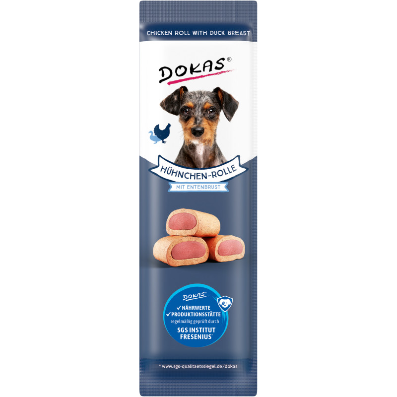 En mjuk kycklingrulle med krämigt ankahjärta smakar gott för alla hundar. Delikatessen innehåller totalt 93 % kött (kycklingbröst, kycklinglever, ankakött). Dokas produkter är spannmåls- och sojafria och innehåller inget tillsatt socker. Dessutom har de en mycket hög kött/fiskhalt. Rena och naturliga råvaror säkerställer produktens hälsa och höga näringsvärde, och garanterar den bästa smaken!