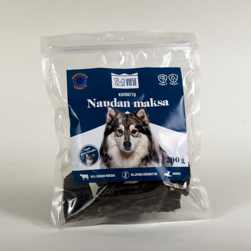 Viksu naudanmaksapala on aromikas, vähärasvainen ja proteiinipitoinen herkku kaikenkokoisille koirille. Maksa on oikea vitamiini- ja ravinnepommi: se sisältää mm. A-, B-, C-, D-, ja K-vitamiineja sekä useita tarpeellisia kivennäis- ja hivenaineita. 100% luonnollinen, yhden ainesosan herkku ei sisällä lisä- ja väriaineita, viljoja tai muuta turhaa – sopii myös herkkävatsaisille. Paloiteltuna erinomainen koulutusnami!