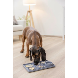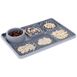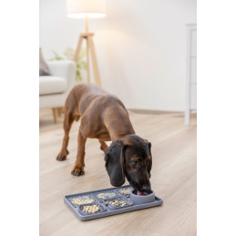 Nopea hotkiminen voi aiheuttaa lemmikille ruoansulatusongelmia ja stressiä. Nuolumatto auttaa hidastamaan syömistä ja tarjoaa samalla aktivoivaa tekemistä. Märkäruoalle, raakaruoalle tahnoille ja muille levitettäville ruoille suunniteltu pinta pidentää ruokailuhetkeä, mikä vähentää ahmimista ja edistää tasapainoista ruoansulatusta. Nuoleminen on lemmikille luontainen tapa rauhoittua, ja tämä alusta tukee rauhoittumista myös stressaavien tilanteiden, kuten eläinlääkärikäynnin jälkeen. Alustassa on erilaisia pintakuviota, jotka stimuloivat lemmikin kieltä ja rentouttavat leuan ja niskan lihaksia. Alustassa on myös juomakuppi, johon voit laittaa vettä tai muuta lemmikille sopivaa nestettä edistämään sen juomista. Pinnan muotoilun ansiosta ruoka levittyy tasaisesti, mikä rohkaisee lemmikkiä käyttämään aikaa ruokailuun. Pohjan imukupit pitävät alustan tukevasti paikoillaan kaikilla sileillä pinnoilla, joten se ei liu’u lattialla tai aiheuta häiriötä ruokailun aikana. Kestävästä silikonista valmistettu alusta on helppo puhdistaa juoksevan veden alla, joten se pysyy hygieenisenä päivittäisessä käytössä.