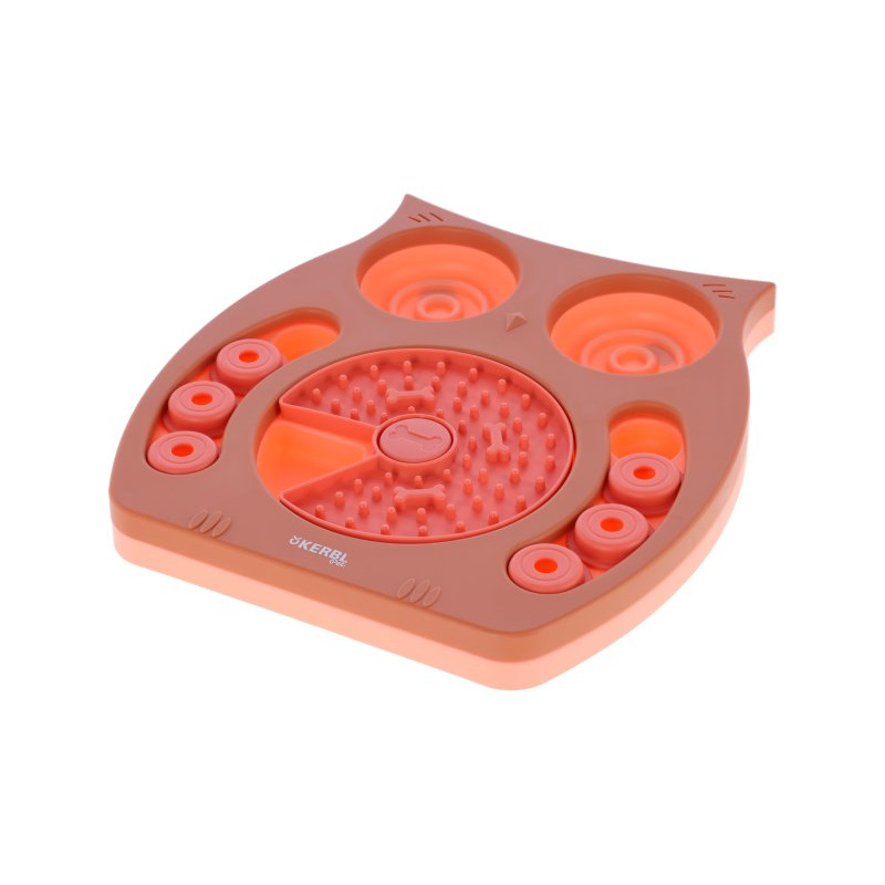 Kerblin pöllömuotoinen aktivointilelu tuo vaihtelua lemmikin arkeen. Lelun voi täyttää lemmikin lempivälipaloilla ja herkuilla, mikä tekee siitä houkuttelevan ja innostavan ajanvietteen. Nuolemislevy soveltuu erinomaisesti tahnojen ja pehmeiden herkkujen tarjoiluun, mikä pidentää leikkihetkeä ja lisää haastetta. Lelun käyttö hidastaa syömistä, ehkäisee hotkimista ja auttaa lemmikkiä keskittymään ruokailuun rauhallisesti. Tämä vähentää stressiä ja pitää mielen virkeänä esimerkiksi silloin, kun eläin jää yksin kotiin. Aktivointilelu soveltuu sekä kissoille että pienille ja keskikokoisille koirille.