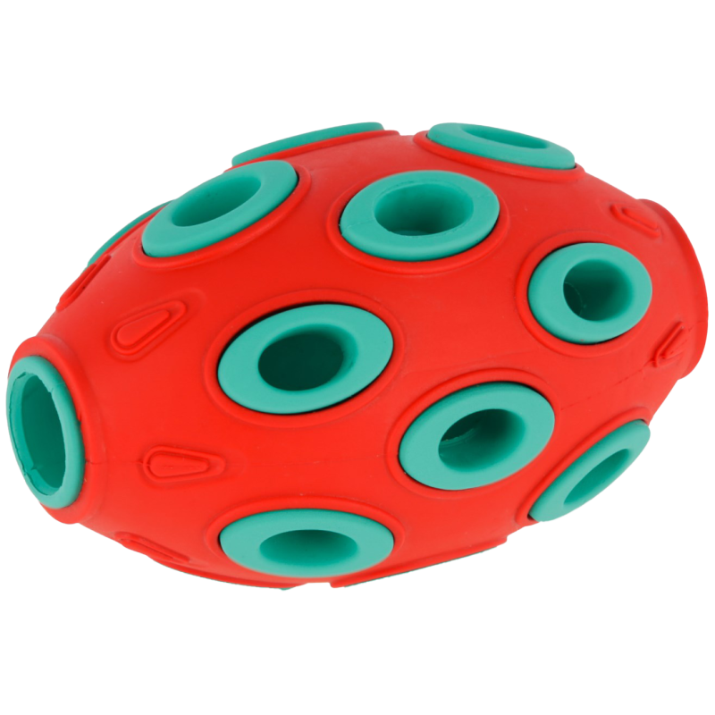 Kerblin täytettävä rugbypallo tarjoaa koirallesi sekä viihdykettä että virikkeitä päivään. Pallon sisälle voi kätkeä herkkuja tai kuivamuonaa, jotka houkuttelevat koiraa pyörittämään ja kantamaan lelua yhä uudelleen. Pinnan kolot vapauttavat herkut vähitellen, mikä tekee leikistä palkitsevaa ja haastavaa. Päädyissä olevien reikien ansiosta pallon täyttäminen on helppoa ja nopeaa. Kestävästä kumista valmistettu pallo kestää innokkaankin käytön, mutta on samalla hellävarainen hampaille ja ikenille. Kompakti koko (12 x 7,5 cm) tekee pallosta sopivan monen kokoisille koirille ja sen kirkas väri helpottaa löytämistä niin sisällä kuin ulkona.