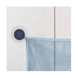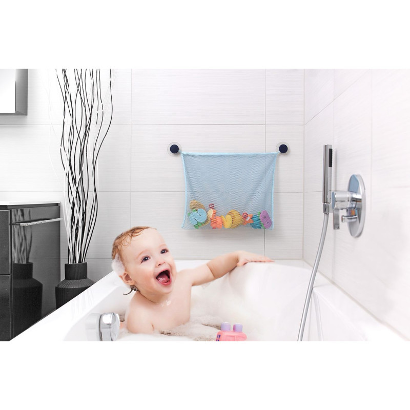 Käytännöllinen säilytysverkko pitää kylpylelut järjestyksessä ja antaa niiden kuivua hyvin. Verkko on helppo kiinnittää kaakeliin, saunanoveen tms. mukana tulevilla suurilla imukupeilla. Nopea kuivuminen estää homeen syntymistä.