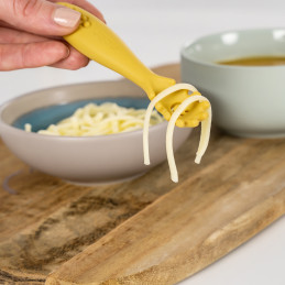 Kolme erimuotoista lusikkaa eri ruokalajeille: soseet, pastat ja kiinteät palat