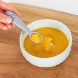 Silikoni on materiaalina pehmeä ja miellyttävä lapsen suussa. Se ei sisällä BPA:ta ja kestää niin mikroaaltouunin kuin astianpesukoneen käytön. Yhdestä kappaleesta valmistettu rakenne takaa, ettei lusikasta irtoa pieniä osia. EN 14372 -sertifiointi varmistaa, että tuote täyttää lasten ruokailutuotteille asetetut turvallisuusvaatimukset.