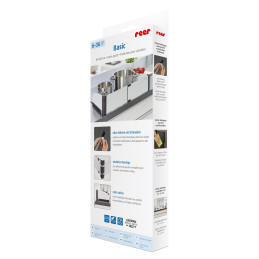 Helppo asennus ja puhdistus: käytännöllinen pikasovitusjärjestelmä ei vaadi poraamista tai ruuvaamista. Suojan voi pestä vedellä ja miedolla pesuaineella Hyvin suunnitellun pikalukitusjärjestelmän ansiosta suoja voidaan koota ja purkaa muutamalla helpolla vaiheella. Erityisesti kehitetty teippi varmistaa tukevan kiinnityksen ilman työkaluja. Kun suojaa ei enää tarvita, teippi voidaan irrottaa jälkiä jättämättä. Lieden puhdistamista varten aikuinen voi nopeasti irrottaa suojan pidikelistoistaan. Metallista ja kuumuutta kestävästä muovista valmistetut osat voidaan puhdistaa lämpimällä vedellä ja miedolla pesuaineella.