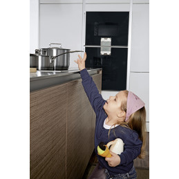 Helppo asennus ja puhdistus: käytännöllinen pikasovitusjärjestelmä ei vaadi poraamista tai ruuvaamista. Kaikki osat ovat konepestäviä. Hyvin suunnitellun pikalukitusjärjestelmän ansiosta suoja voidaan koota ja purkaa muutamalla helpolla vaiheella. Erityisesti kehitetty teippi varmistaa tukevan kiinnityksen ilman työkaluja. Kun suojaa ei enää tarvita, teippi voidaan irrottaa jälkiä jättämättä. Lieden puhdistamista varten aikuinen voi nopeasti irrottaa suojan pidikelistoistaan. Osat voi pestä tiskikoneessa.