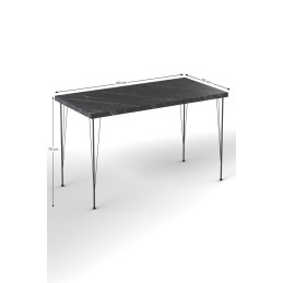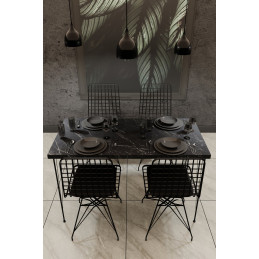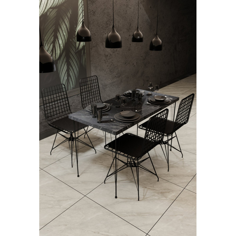 Elegantti, ilmava metallirunkoinen ruokailuryhmä neljällä tuolilla. Musta marmorisävytteinen pinta luo omaa tunnelmaa, ja sopii mainiosti moderniin sisustukseen.